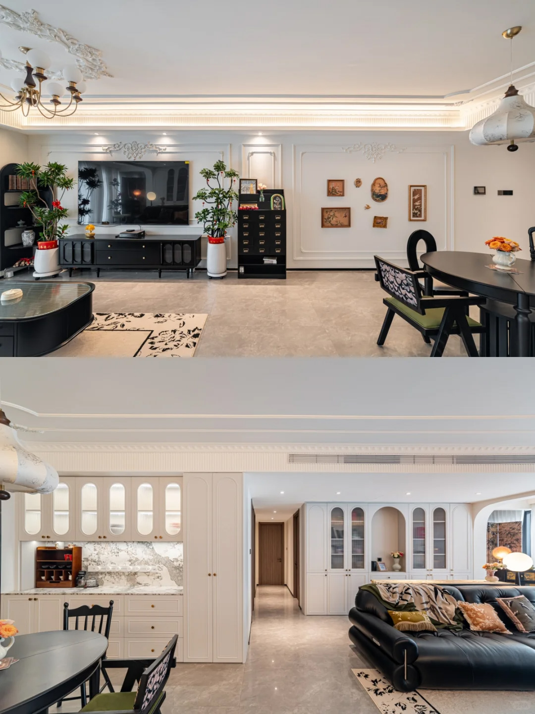 色彩材质:奶油白为主+焦糖黑点缀,石膏线条/角花增贵气
