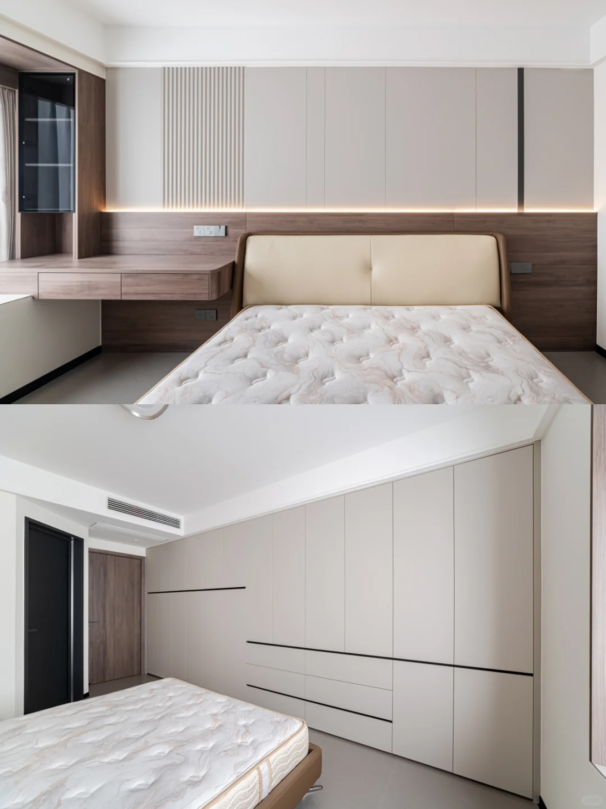 主卧奶茶色+原木色背景墙+奶白软包床头,温柔治愈~